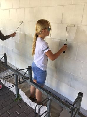 Gleichzeitig waren viele Helfer rund um die Projektwoche “Unsere Schule wird bunt“ im Einsatz. Die Säulen wurden bemalt, Spielstationen für die Pause wurden entworfen, Heckentiere, Betonsteine, Garderoben wurden gestaltet, eine Sitzschlange wurde errichtet und mit Mosaiken verziert.